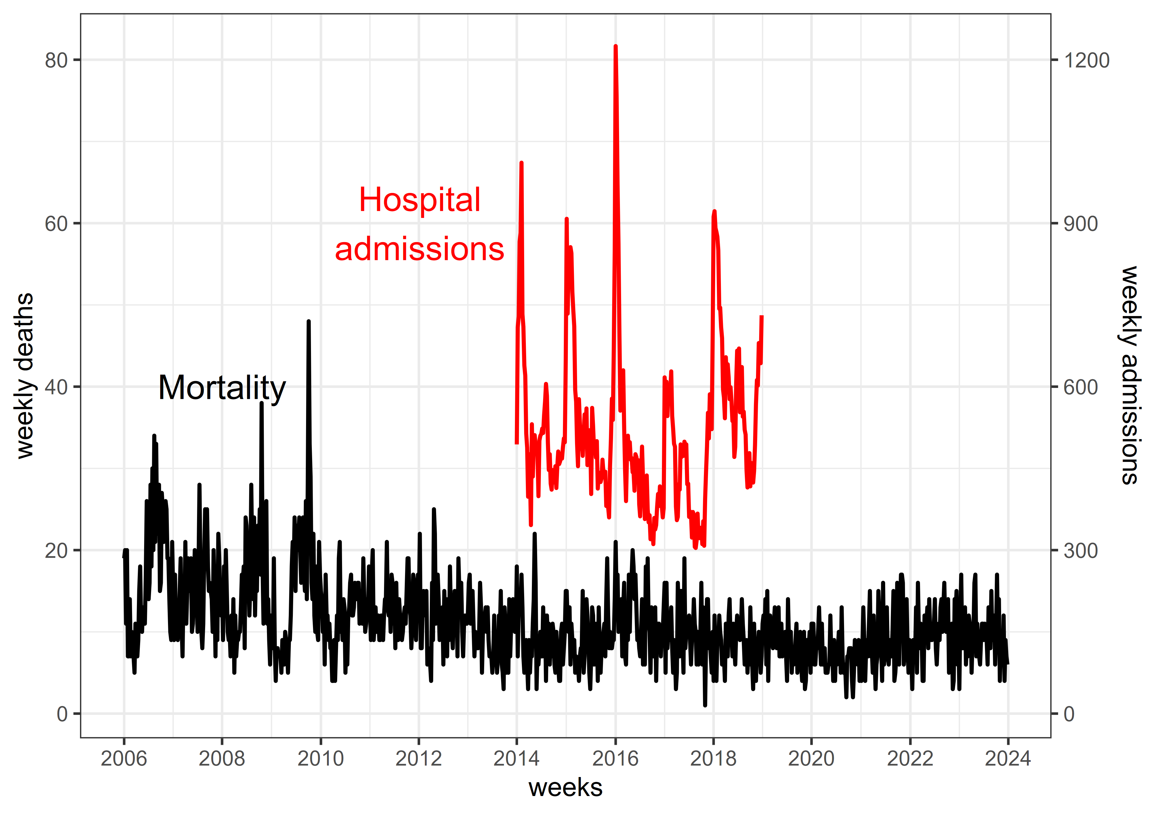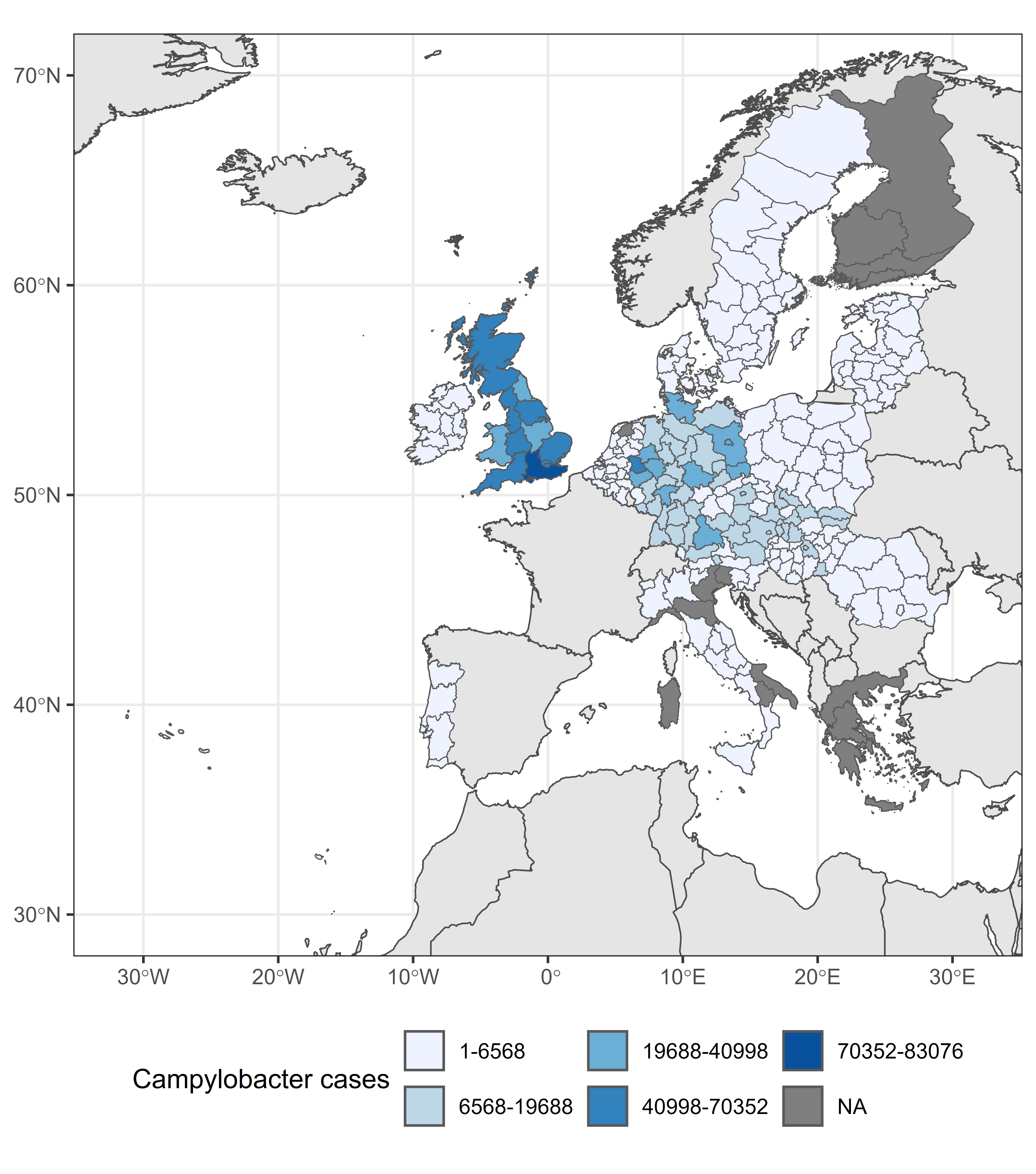The raw enteric diseases data were processed into weekly time series at the most appropriate subnational administrative level (i.e., aggregation at a higher subnational level was done whenever the number of cases was too few). The weekly format was primarily based on ISO weeks, while some countries used EPI weeks to maintain a consistent 7-day aggregation, with the year value aligning with either the ISO or EPI week formats. Figure 1, Figure 2, and Figure 3 are sample plots of the spatial and temporal resolution of the processed enteric disease dataset.