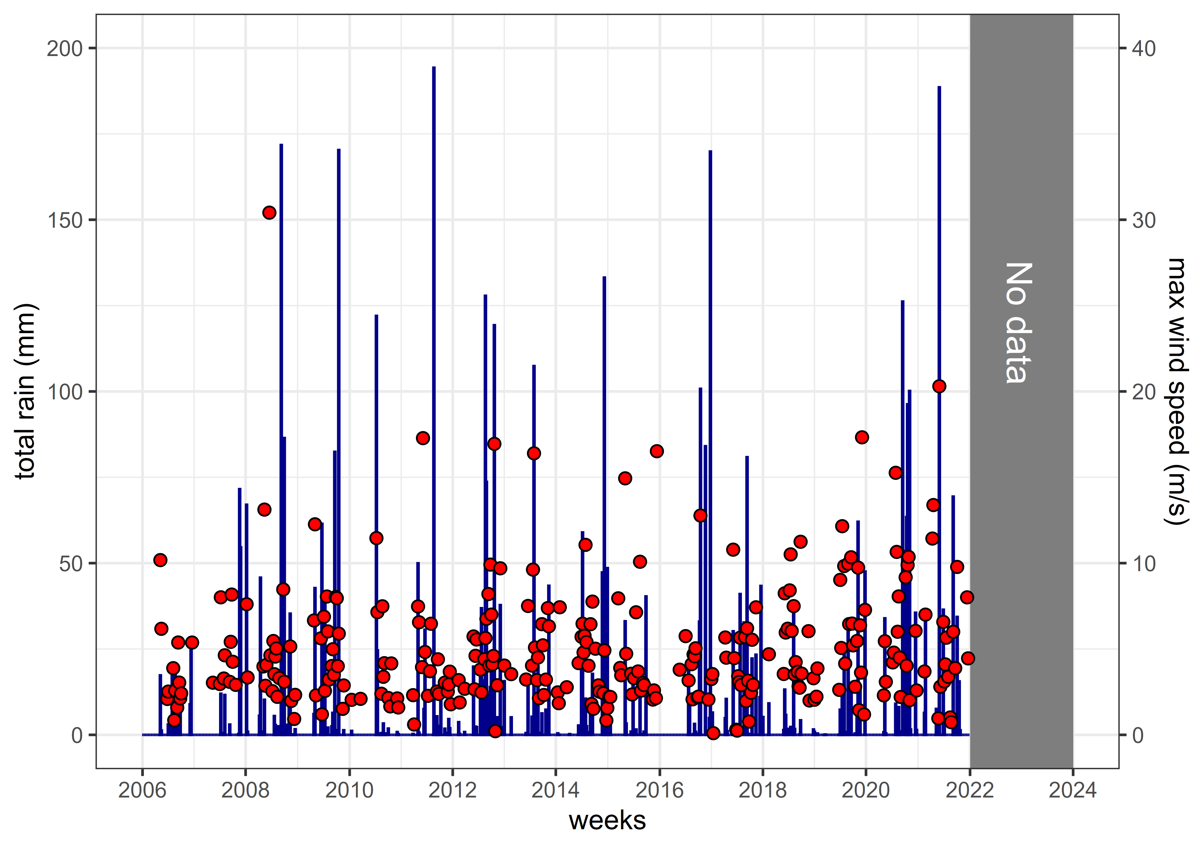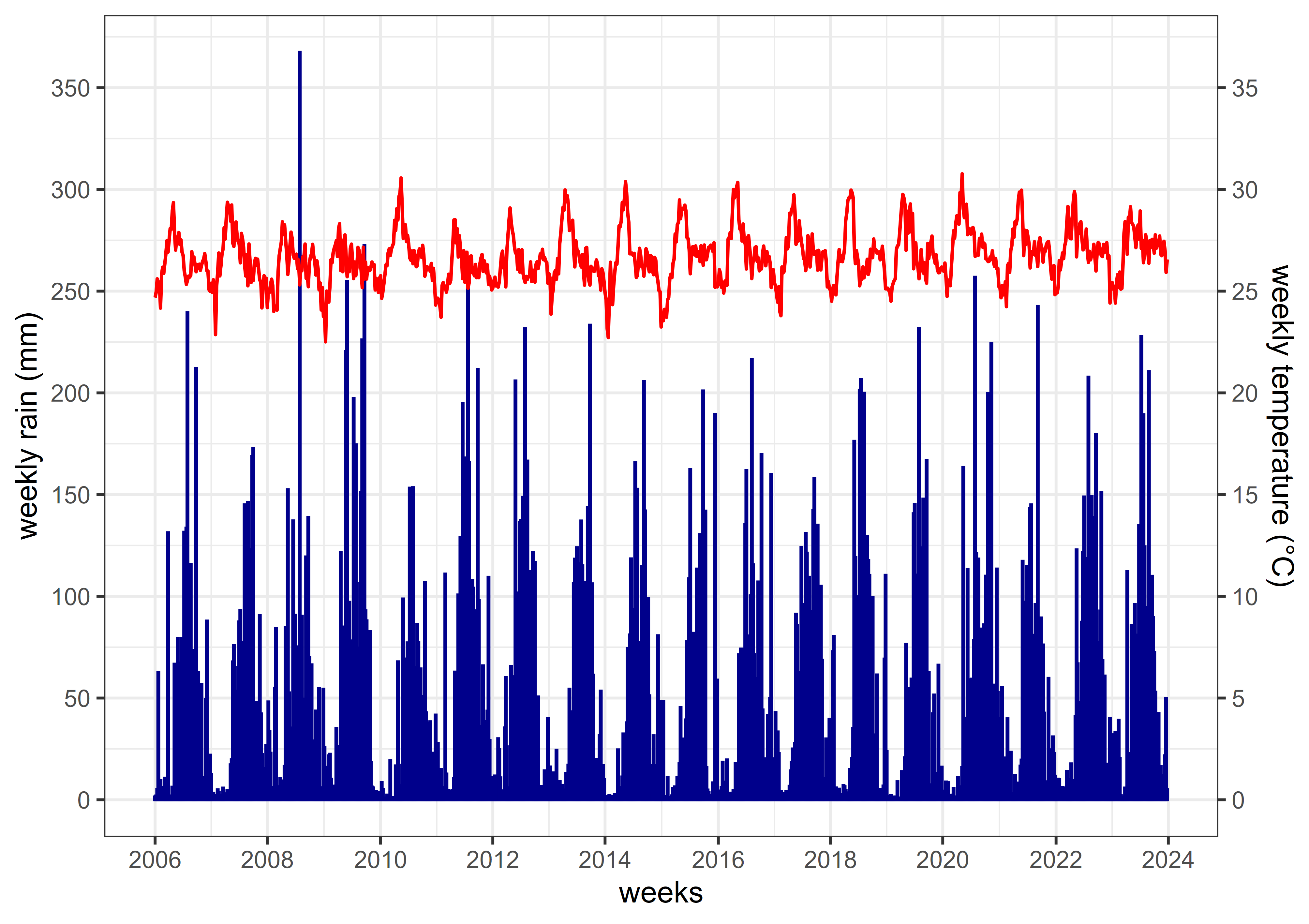 Climate-related exposures were extracted from open-source datasets using bespoke R functions to fit the temporal and spatial resolution of the enteric diseases data (i.e., considering local time zones). Initial climate-related exposures included 2-meter temperature (°C) and total precipitation (mm) collected from ERA5 (i.e., Fifth generation re-analysis data by European Centre for Medium-Range Weather Forecasts) and ERA5-Land (via Climate Data Store), as well as sustained maximum wind speed (m/s) and total rainfall (mm) due to tropical cyclones collected from ISIMIP3a (via ISIMIP Repository). Two wind field models (i.e., Holland, 2008 and Emanuel & Rotunno, 2011) for tropical cyclone data are available (Frieler et al., 2024). Population density from GPWv411 (Gridded Population of the World Version 4.11) and climate zone categorization from Beck et al. (2023) were extracted for each subnational level. All R and Python codes are available here. Figure 4 and Figure 5 are sample plots of climate-related variables extracted.